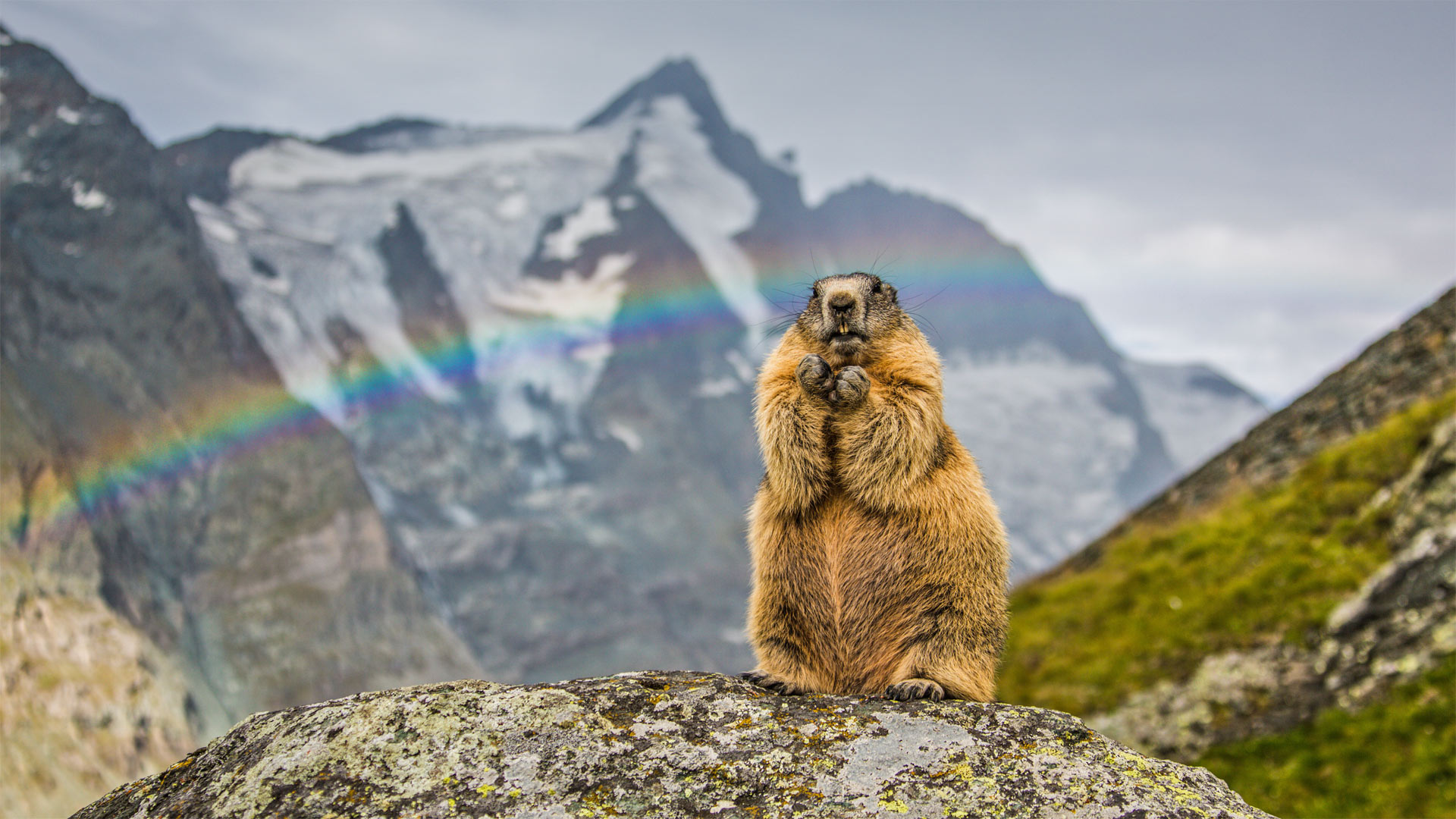大格洛克纳山山峰前的土拨鼠,奥地利 (© SeppFriedhuber/盖蒂图片社)
